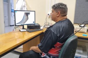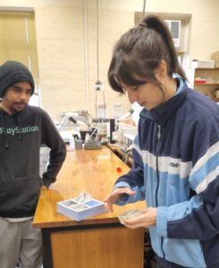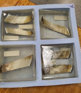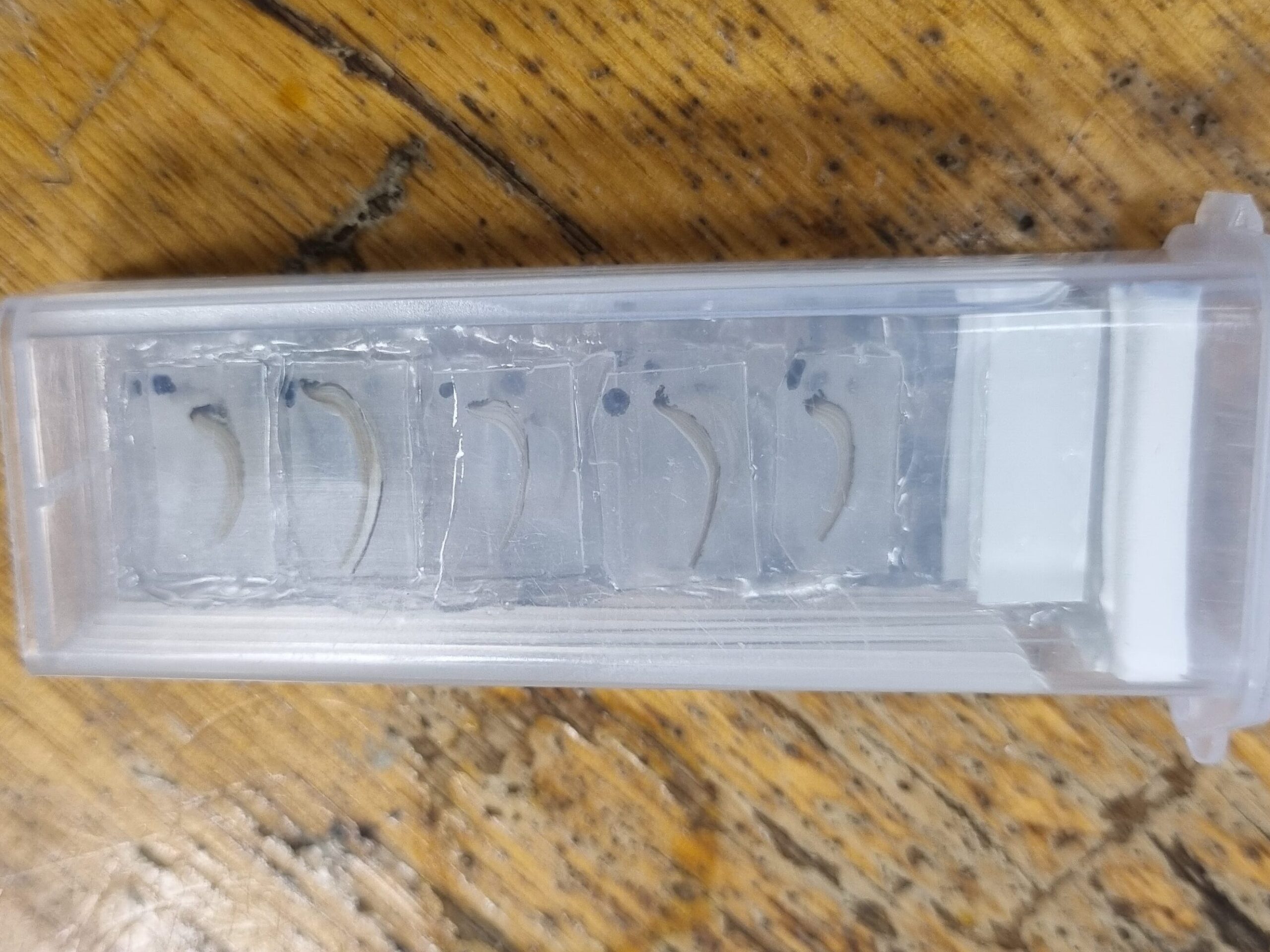 Rhiannon Van Eck showed us the fascinating lab process: slicing through the shells using a fine diamond saw, then setting them in resin so she can safely cut thin sections. Each slice goes through the umbo (the ‘nose’ of the shell) — about the size of a fingernail — which we then examined under a microscope and projected onto a screen.